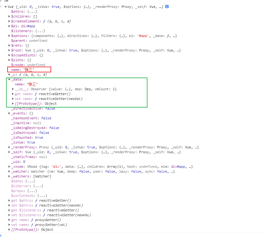 通过 Object.defineProperty () 把_.data 对象中所有属性添加到 vm 上。为每一个添加到 vm 上的属性,都指定一个 getter/setter。在 getter/setter 内部去操作(读 / 写)data 中对应的属性。